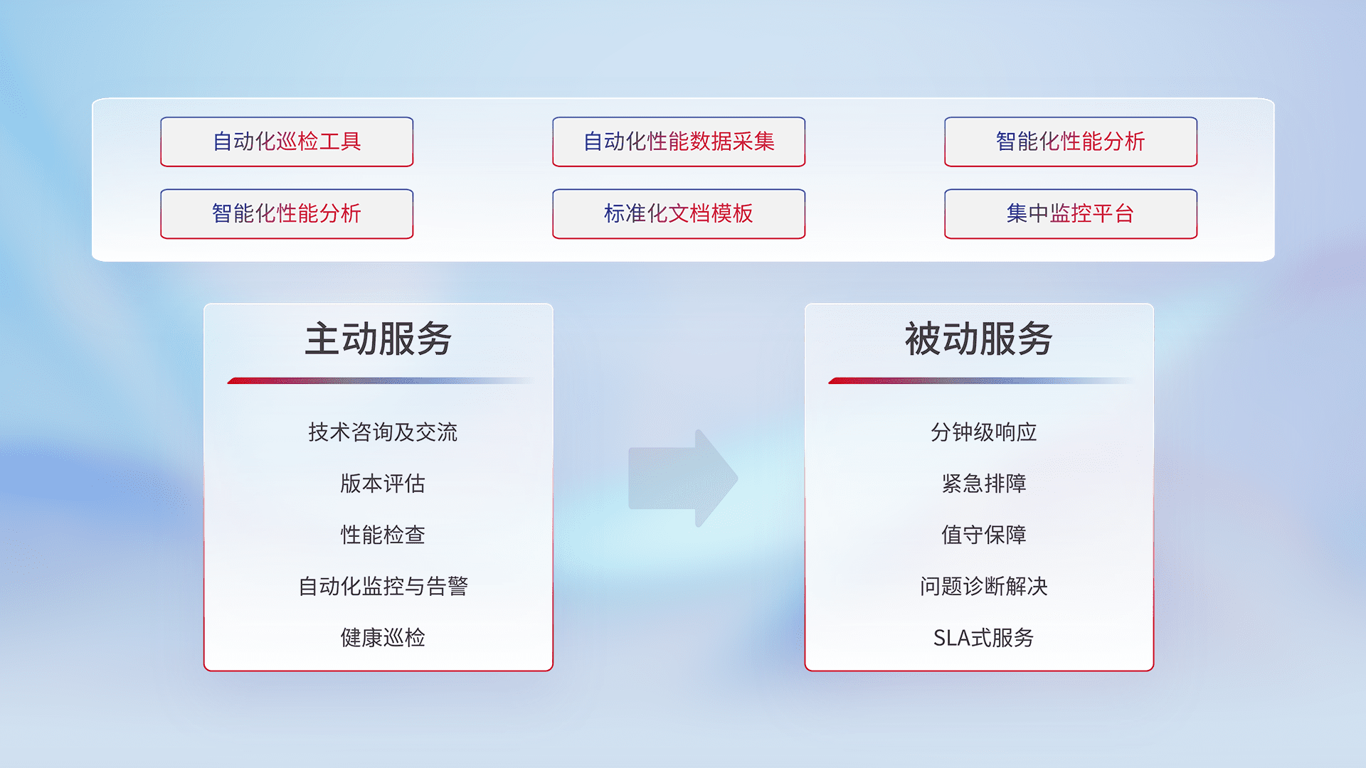 智能化工具和标准化文档,,,,保障服务质量,,提供主动服务(包含技术咨询、、、、版本评估、、、性能检查、、、自动化监控与告警、、、健康巡检)和被动服务包含(分钟级响应、、、紧急排障、、、、值守保障、、、问题诊断解决、、SLA服务)。。。